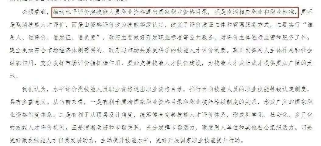 只是由资格评价改为技能等级认定,改变了评价发证主体和管理服务方式,实行“谁用人、谁评价、谁发证、谁负责”,真正发挥用人主体作用和社会组织作用,为技能人才成长成才提供更加广阔的天地