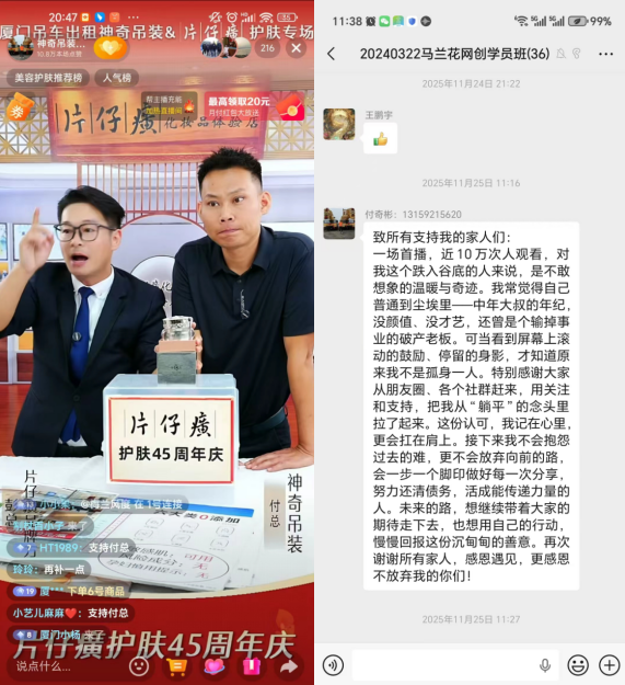 2025年11月23日,付奇彬开启自己的首场直播,近10万人次的观看,近14万的销售额,让这个破产老板久久不能平静:“这不仅仅是十几万的销售业绩,更是对我这学习的肯定,是对我人生新方向的验证。”