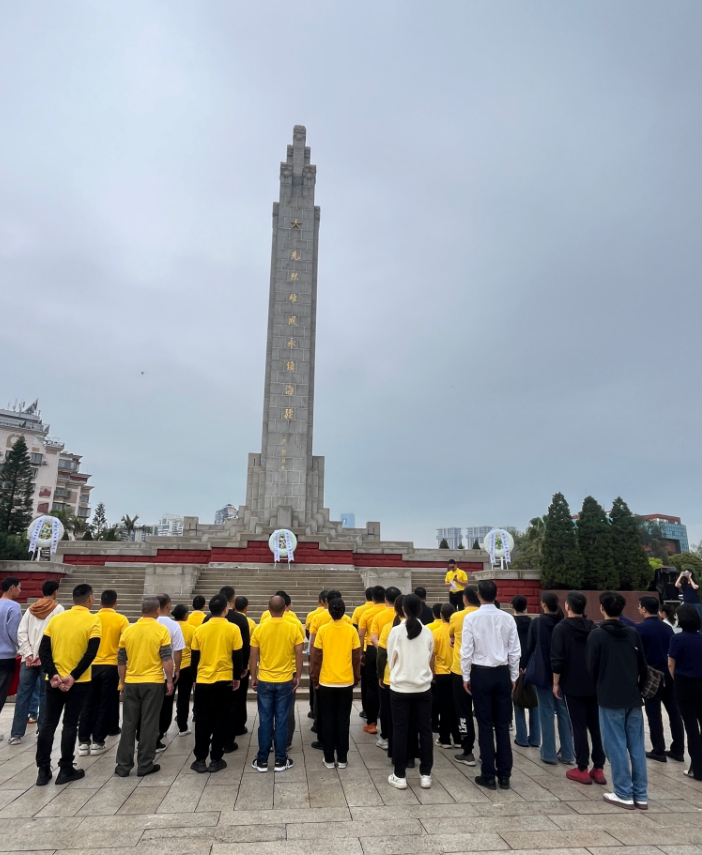 当日细雨霏霏,陵园庄严肃穆。在革命烈士纪念塔前,全体人员整齐列队、肃穆站立。随着仪式开始号令,缅怀活动正式启动。现场党员排列成整齐方阵,身姿挺拔、目光坚毅,展现出严明纪律与强烈使命担当。激昂的国歌声在陵园上空回荡,全体党员齐声高唱,以铿锵歌声抒发对祖国的赤诚与对先烈的敬意。